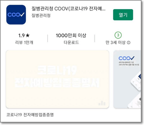 1) 앱스토어를 통해 쿠브 앱을 다운받아 줍니다. 정식 명칭은 '질병관리청 COOV(코로나19 전자예방접종증명서)입니다.