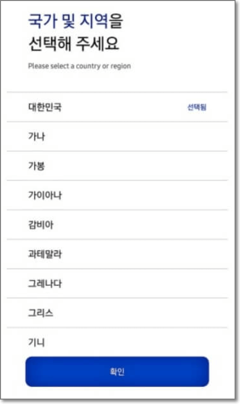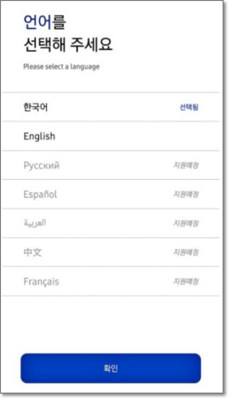2) 쿠브증명서 앱을 설치했다면 실행해주고 첫 화면에서 언어와 국가 및 지역을 골라줍니다.