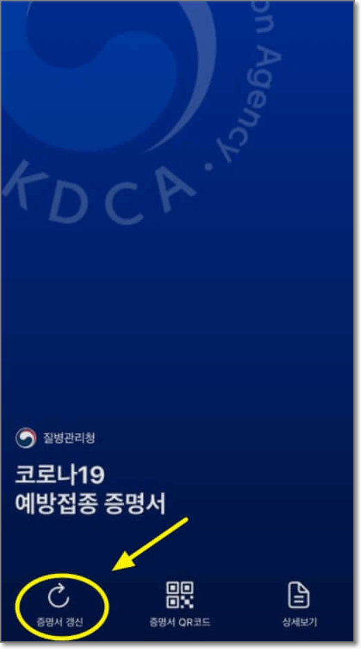 8) 여기까지 완료했으면 아래와 같이 예방접종증명서가 발급됩니다. 여기에서 아래의 [증명서 갱신]을 눌러 갱신을 해주면 본인이 완료한 접종 차 수가 최신으로 갱신됩니다. 반드시 갱신을 해줍니다.